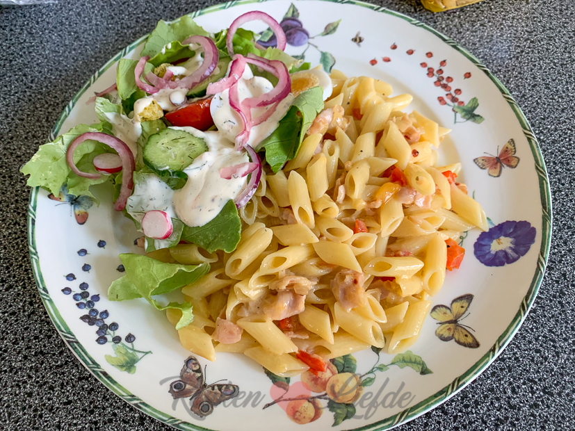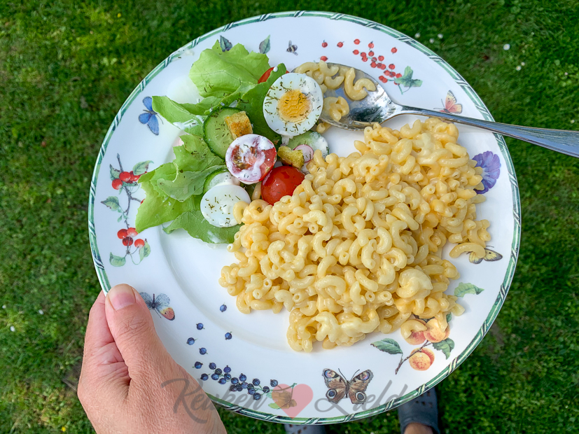 Ella-Marie eet ’s avonds wat eerder omdat ze naar de scouting gaat. Ik had nog gekookte macaroni in de koelkast staan die over was van gisteren. Op verzoek van Ella warm ik die even op in de magnetron. De laatste 30 seconden in de magnetron een plakje smelt cheddar en plakje jong belegen erop en je hebt mac and cheese! Johan en ik eten pasta carbonara als avondeten. Met een beetje sla erbij.