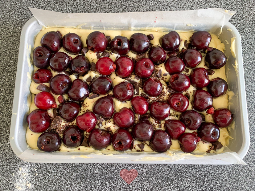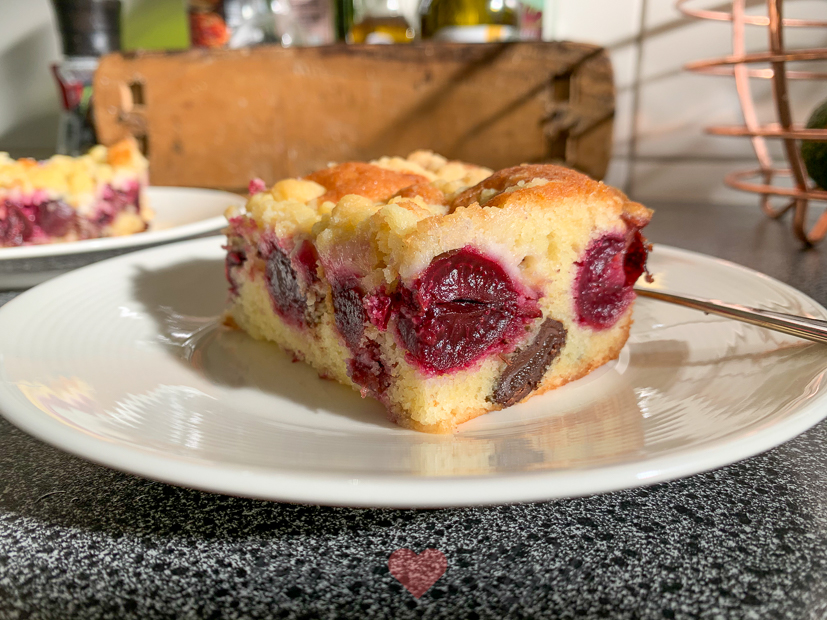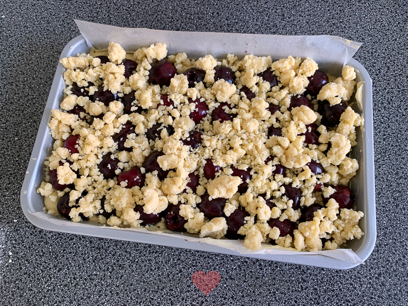 Voor Vaderdag morgen bak ik een lekkere kersen-kruimelcake met chocolade. Ik maakte dit recept, maar de jam verving ik door ongeveer een halve kilo ontpitte kersen en een handje gehakte pure chocolade. Oh, en ik roerde een vleugje Kirsch door het beslag. 😉 Hij moest wel iets langer in de oven, ongeveer 10 minuten langer. (Bij maandag zie je een foto van het eindresultaat.)