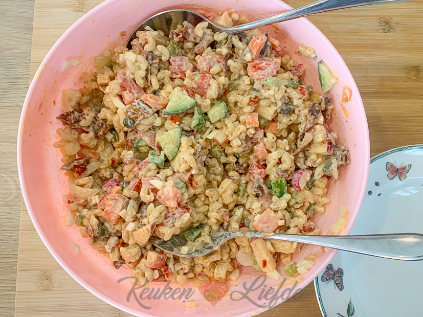 We beginnen de week met een zelfgemaakte pastasalade a la Johan. Altijd goed. We aten hem binnen op terwijl we het EK-voetbal keken. Toch wel weer leuk zo’n sportzomer!