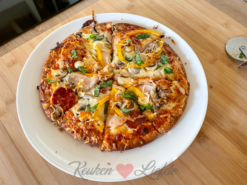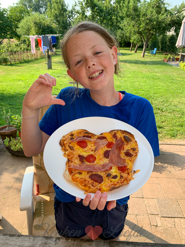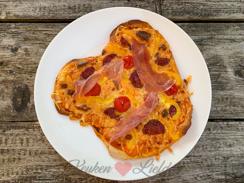Ja la la laaa! Vandaag eten we pizza! Voor Ella-Marie haal ik een bolletje zelfgemaakt pizzadeeg uit de vriezer die ze zelf mag beleggen, Johan en ik eten een diepvries magherita pizza met extra beleg. Pizza komt hier regelmatig op tafel als we een drukke, rommelige werkdag achter de rug hebben en van tevoren niet hebben nagedacht over het avondeten. Vaak hebben we dan geen zin meer om boodschappen te doen, of om te koken en dan is pizza het makkelijke en snelle antwoordt. Ben benieuwd, wat zet jij op zulke dagen op tafel?