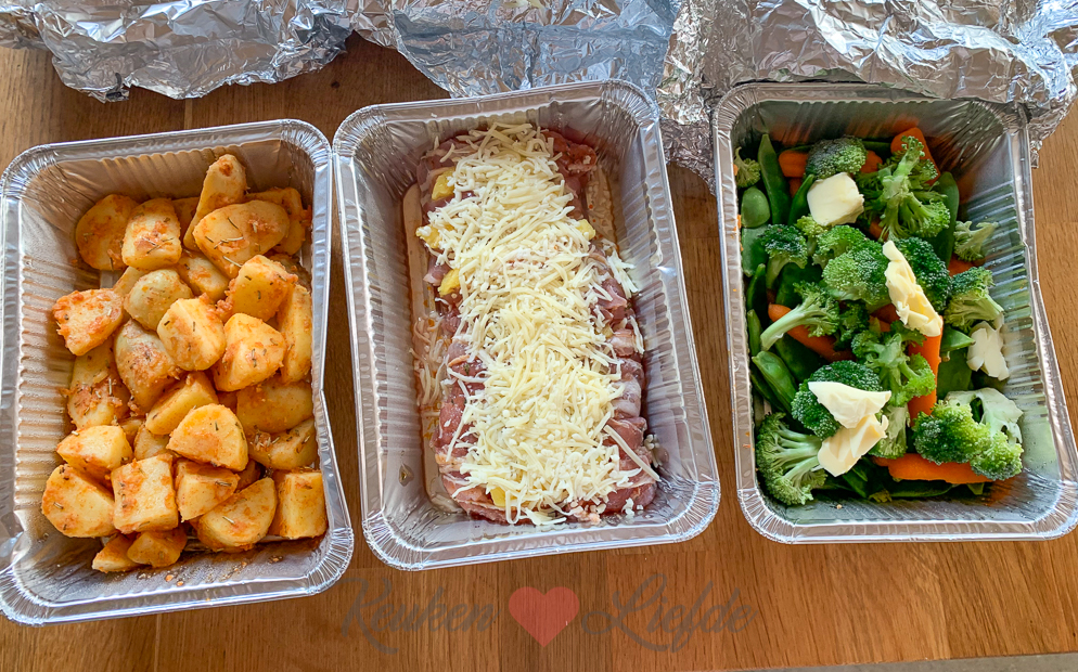 Vanavond willen we bbq’en en daar bereid ik alvast het een en ander voor voor. Ik maak drie barbecuebakjes klaar met voorgekookte en gemarineerde aardappeltjes, een bakje met groenten en een bakje met gemarineerde varkenshaas die ik vul met ananas, omwikkel met spek en bestrooi met een beetje kaas. Vanavond kunnen ze zo op de barbecue gezet worden.