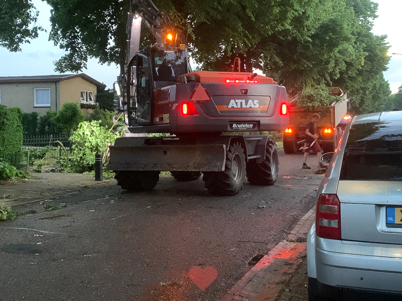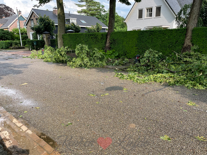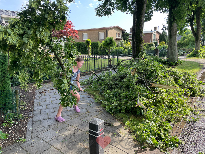 Eind van de middag gaan Johan en ik nog even naar de Action. Ella had geen zin om mee te gaan en bleef alleen thuis. Als we door de paden van de Action lopen krijgt Johan een telefoontje van Ella. Ze is helemaal in paniek en in tranen probeert ze te vertellen wat Johan en ik op de achtergrond door het raam al zien. Een enorme hoosbui heeft de achtertuin veranderd in een kolkende woesternij met rondvliegende takken, parasols, tuinkussens en leesvoer. Zo snel als we kunnen rekenen we af en rijden terug naar huis. Het is inmiddels droog en het zonnetje schijnt hier en daar verlegen door het grijze wolkendek. We kunnen bijna niet geloven dat de beelden die we zagen op de telefoon net gebeurd zijn. Als we ons dorp inrijden zien we een grote ravage. Hele bomen liggen met wortel en al op het wegdek en alles ligt bezaaid met takken. Als we onze straat inrijden zijn mensen overal al bezig om de weg vrij te maken en takken op te ruimen. Ella-Marie staat ons thuis in tranen op te wachten. Pfffff, wat een schrik! Niet veel later werd onze straat afgesloten en is de gemeente met een hoogwerker de hele avond bezig geweest om losse takken uit de bomen te halen en alles op te ruimen.