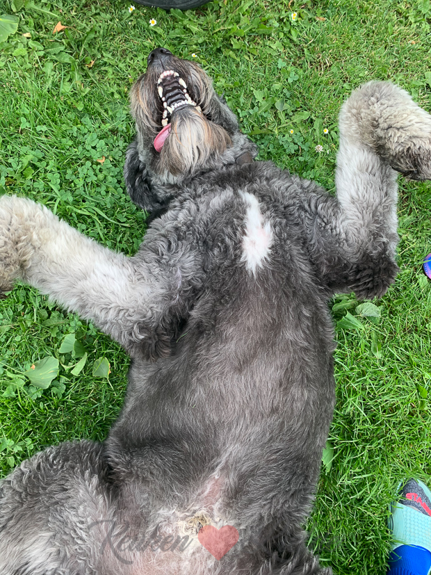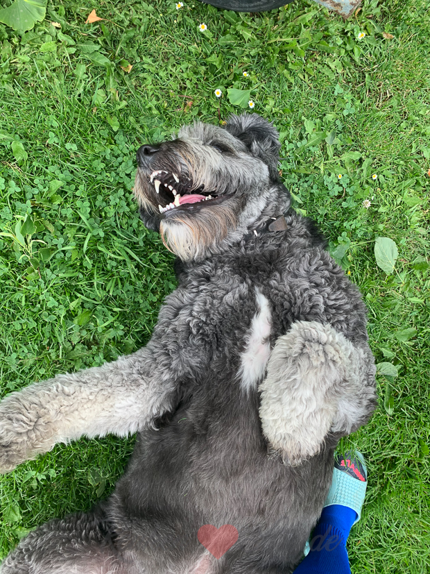 Deze zwarte doodle houdt van chillen op het gras en eindeloze buikkrabbels.