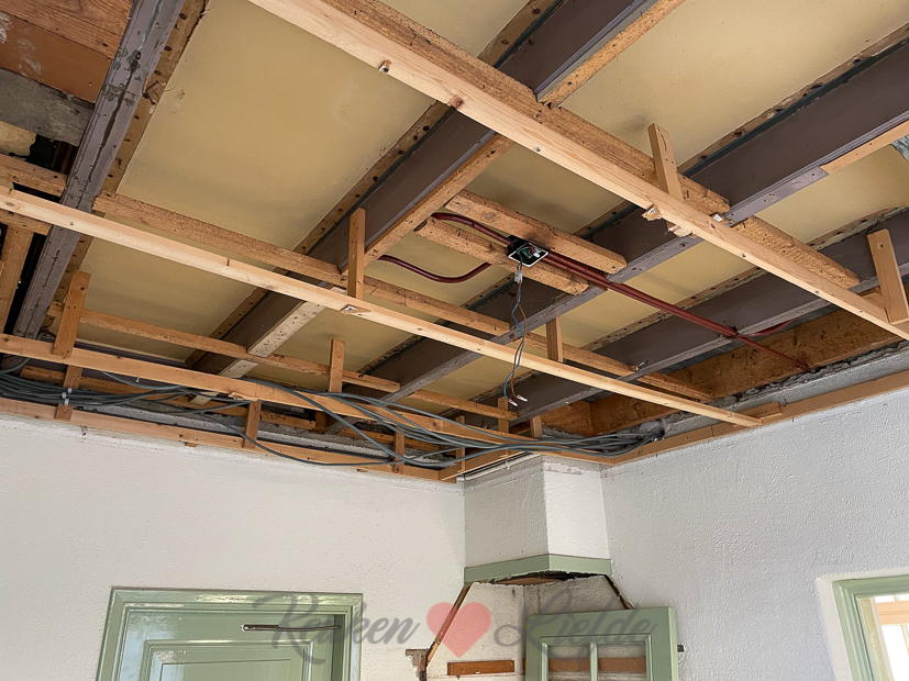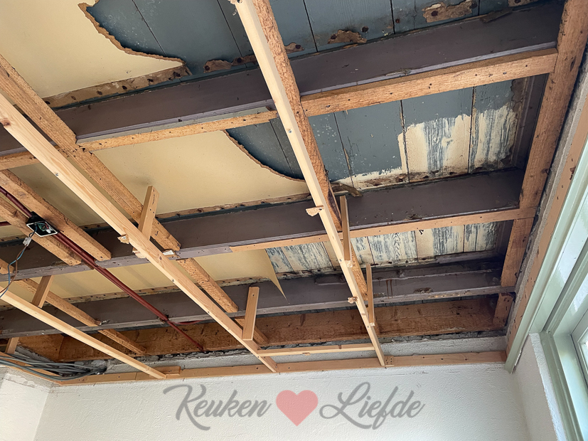 Na het eten sloopt Johan het plafond in onze oude keuken eruit. Er komt een prachtig balkenplafond tevoorschijn.