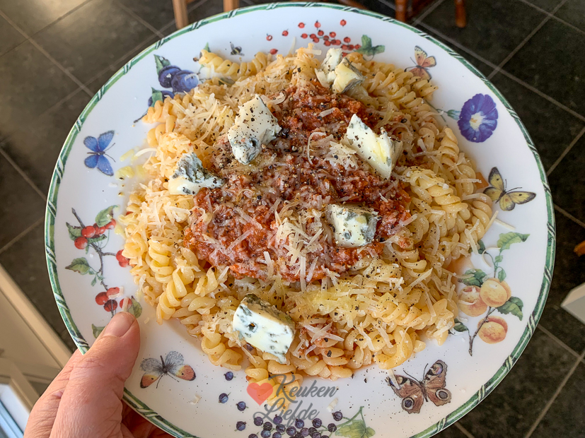 En weer een weekend voorbij. Als iedereen weer de deur uit is, ga ik thuis op kantoor aan het werk. ’s Middags ga ik even bij mijn ouders langs en neem ik Nacho mee. Nacho is dol op autorijden en de loopplank die ik ooit had gekocht is allang niet meer nodig. Zodra de achterklep van de auto opengaat zit meneer er al in. ’s Avonds eten we nog een keer pasta met bolognesesaus. Dit keer kook ik er fusilli pasta bij en leg ik wat gorgonzola bovenop die nog in de koelkast lag.