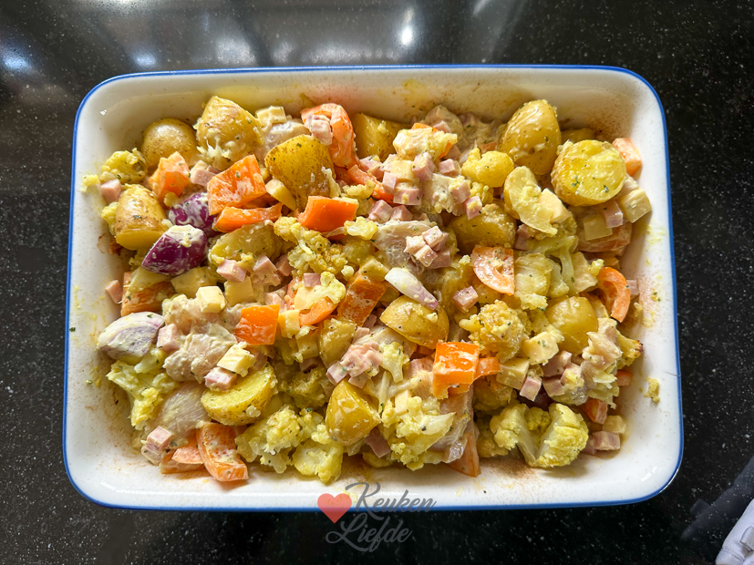 Man wat was dit lekker! Ik snap de hype nu wel. Het recept ga ik snel met je delen. Johan is zo lief om daarna de keuken voor me op te ruimen zodat ik het recept kan uitschrijven. De crispy potato salade is ’s avonds ons avondeten met vissticks en doperwten erbij.
