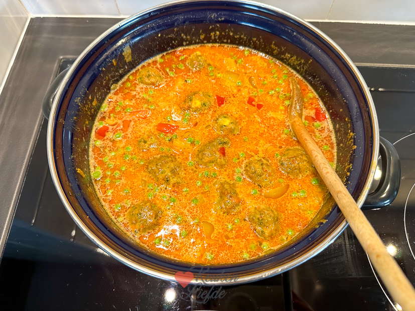 Recept? Fruit een ui en knoflook aan in een hapjes- of braadpan. Bak kort groenten naar keus mee. Ik vond in de koelkast nog twee paprika’s en in de vriezer een zak pompoenblokjes en vegetarische groenteballetjes van de IKEA die ik toevoegde. Daarna de currypasta en verkruimeld kippenbouillonblokje (groentebouillonblokje kan ook) erbij en één minuut meebakken. Dan de kokosmelk erbij. Blik omschudden met een goede scheut water en ook toevoegen. Even doorroeren en aan de kook brengen. Dan deksel op de pan en zachtjes laten pruttelen tot de groenten en balletjes gaar zijn. De laatste paar minuten van de kooktijd voegde ik nog een handje diepvrieserwten toe. Ondertussen kun je rijst koken om erbij te serveren. Fairtraide heeft ook groene en rode currypasta. De rode en gele zijn iets pittiger dan de groene die toch wel mijn favoriet is. Maar deze was ook erg lekker. Ella had trouwens geen zin in curry en maakte tomatensoep voor zichzelf en at er een frikandel speciaal hapje bij.