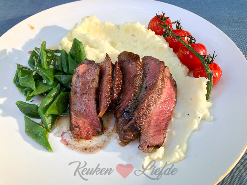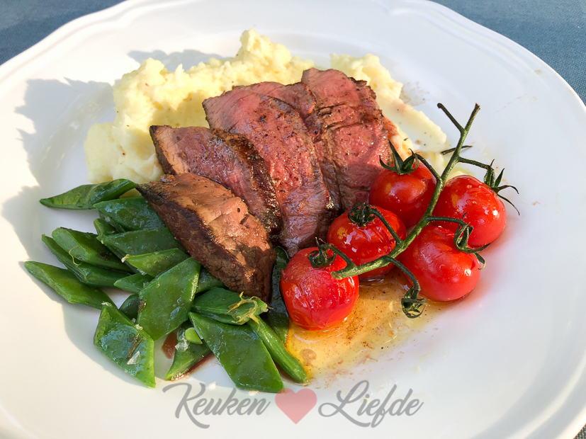 ’s Avonds maak ik iets waar ik al heel lang zin in had: aardappelmousseline (hele romige en luchtige aardappelpuree) met gebakken ossenhaasbiefstuk, verse snijbonen en gepofte cherrytomaten. Ella-Marie at dit gerecht vorig jaar toen we op vakantie waren in de Dordogne in Frankrijk en sindsdien wilde ik het zelf maken. De snijbonen en cherrytomaten zijn trouwens een aanvulling van mijzelf. In Frankrijk is dit dus een kindermenu… I love it! Bekijk de foto’s van Ella’s kindermenu in deze Dordogne-vakantiespecial.