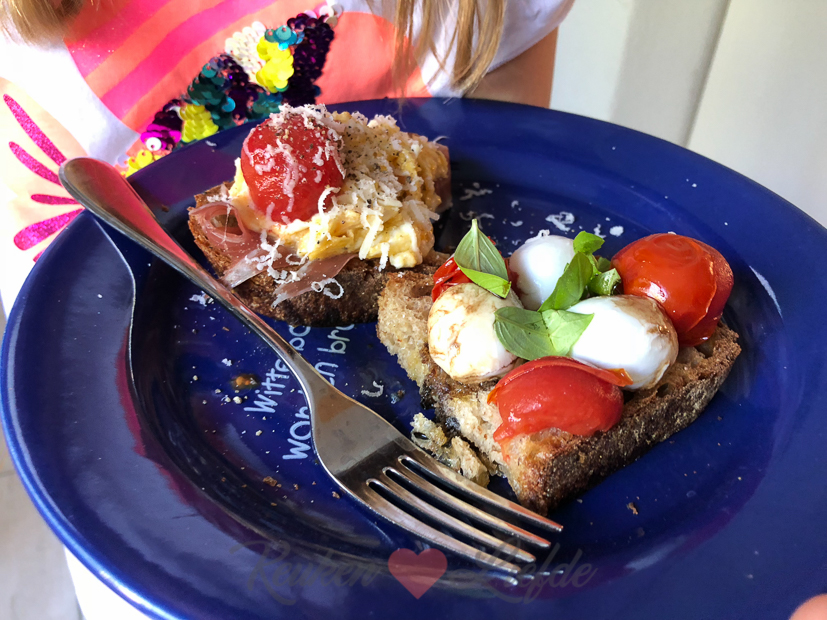 Wederom maakt Johan een lekker ontbijtje: geroosterd brood met truffelroerei, parmaham, gepofte cherrytomaten (Daar zijn ze weer. 🙂 Gepoft in de oven zijn ze zó lekker!) en parmezaan. Speciaal voor Ella maakt Johan ook nog de caprese toast van gisteren want die wil ze ook graag proeven. Kleine smulpaap.