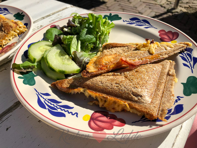 ’s Avonds maakt Johan tosti’s die we lekker buiten in het zonnetje opeten.