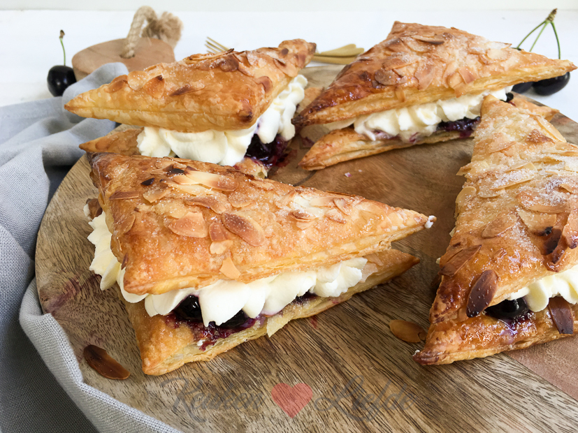 Als we weer thuis zijn ga ik aan de slag in de keuken om kersenflappen te maken. Ik wilde eerste dichte kersenflappen maken (vergelijkbaar met een appelflap), maar op aandringen van Ella-Marie maak ik toch open kersenflappen: krokant bladerdeeg bestrooid met suiker en amandel en gevuld met zelfgemaakte kersenvlaaivulling en slagroom. Lijkt het je wat? 🙂 (Ze zijn VET lekker!) Het recept komt eraan!