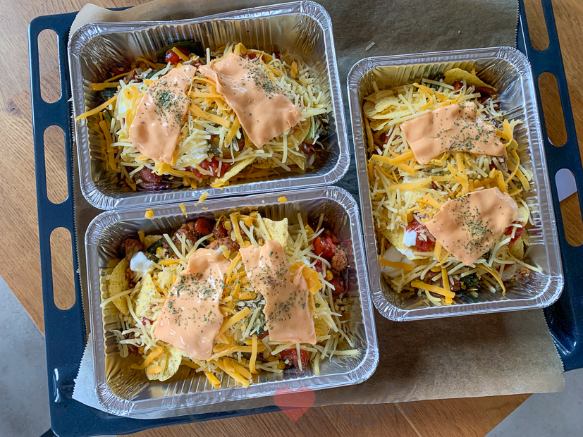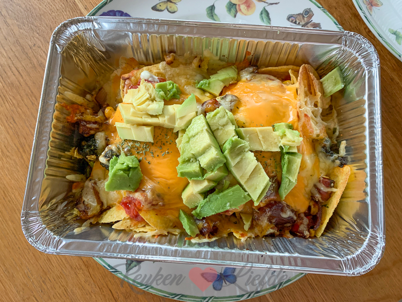 Ik heb de groentelade vol liggen met restjes groenten en in de kelder ligt nog een zak nachochips: loaded groente nacho’s it is! De groenten (bloemkool, broccoli, sjalot, wortel en peulen) snijd ik klein en bak ik op hoog vuur in de koekenpan met wat Mexicaanse kruiden, een lepeltje tomatenpuree en voor de smaak een verkruimelde kippenbouillontablet (kun je eventueel vervangen door zout en peper) tot ze wat kleur krijgen. Dan afblussen met klein scheutje water en verder smoren/bakken tot de groenten beetgaar zijn en het vocht verdampt is. Dan in een ovenschaaltje laagje nachochips, wat groenten, schepjes salsasaus en zure room en kaas (geraspte jong belegen en cheddar) en deze lagen nog een keer herhalen. Eindigen met kaas, een plakje smeltcheddar en wat gedroogde oregano. Paar minuten bakken in de oven tot de kaas gesmolten is. Dan wat avocado eroverheen en smullen maar!