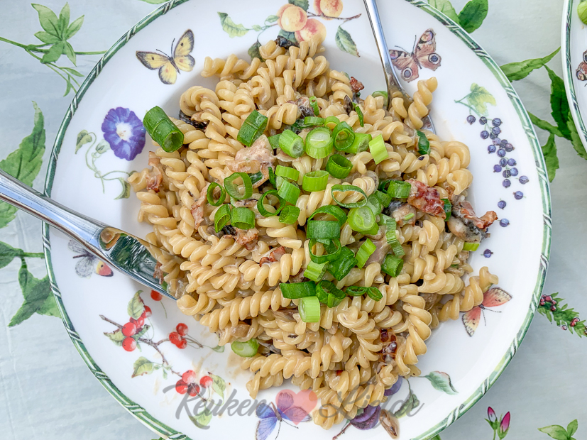 Ella-Marie is naar voetbaltraining en heeft eerder al iets gegeten en terwijl Johan aan het wieden is maak ik binnen snel een pastaatje voor ons klaar met wat gebakken spek, champignons uit de koelkast die op moesten en een flinke scheut room. Altijd goed.