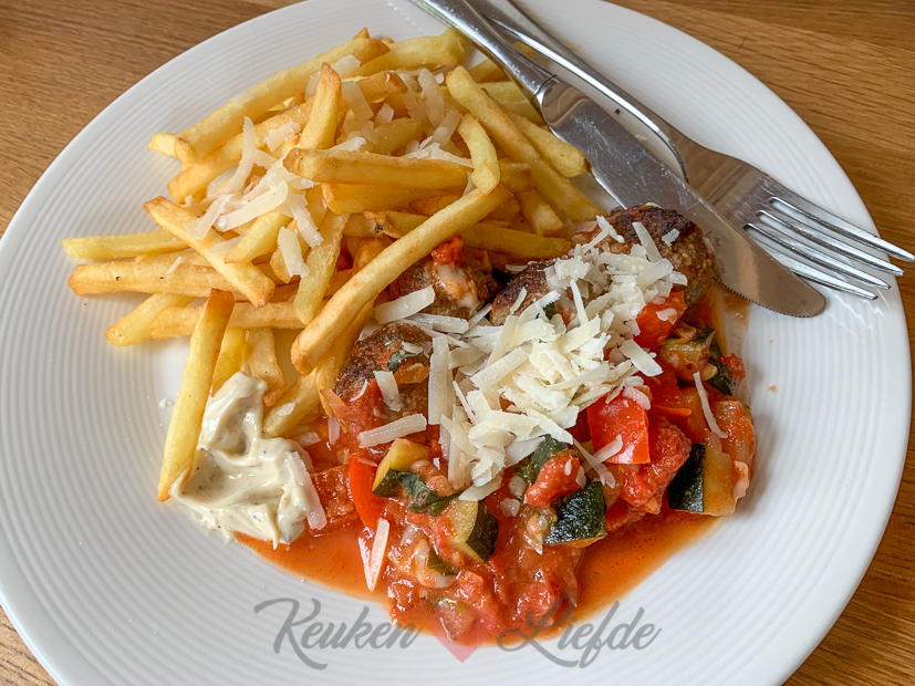 In de ochtend werk ik op kantoor en daarna kook ik nog een recept voor de website. Voor het avondeten warmen we het gerecht ’s avonds nog een keer op en bakken er wat frietjes bij in de airfryer.