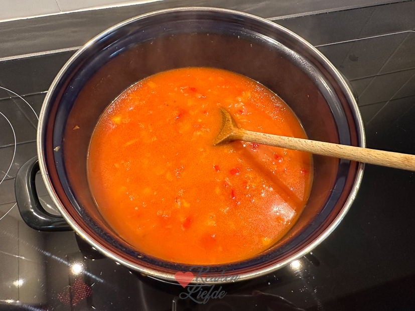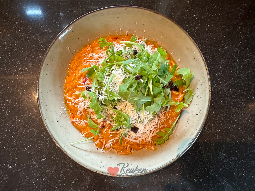 Uitje, knoflook, paprika en chilivlokken aanfruiten in olijfolie. Dan 275 g volkoren orzo, 70 g tomatenpuree en verkruimelde kippenbouillontablet erbij en 1 minuut meebakken. Afblussen met citroensap. Dan onderzetten met water en al roerend in circa 20 minuten gaar koken, net als risotto. Dan scheutje room, klontje roomboter en handje parmezaan erdoor roeren en opscheppen.