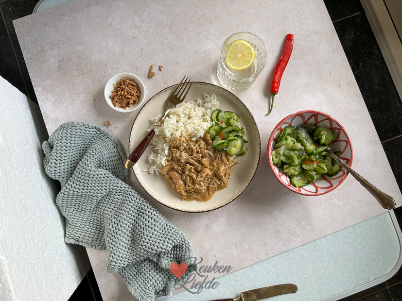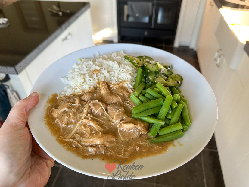 Ik werk ‘s ochtends op kantoor en ‘s middags maak ik een recept voor de website dat meteen ons avondeten is: hete kip! Ik serveer het met rijst en komkommersalade en ‘s avonds kook ik er sperziebonen bij. Was erg lekker!