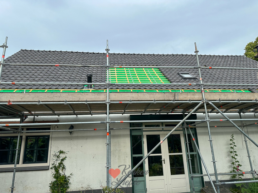 Ella moet vandaag nog 3 toetsen maken, daarna zit het schooljaar erop voor haar! Ondertussen wordt er op ons dak weer hard gewerkt, een groot deel van de dakpannen worden neergelegd.