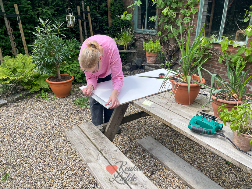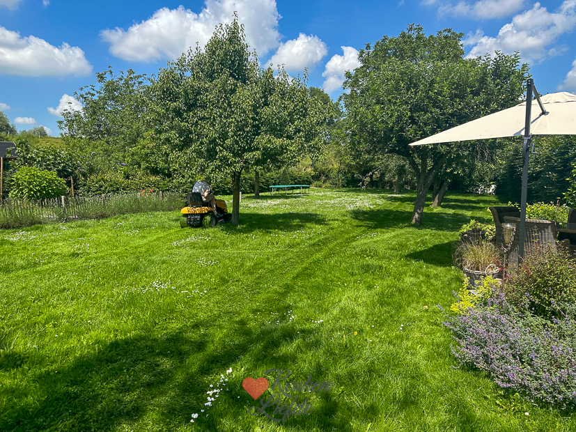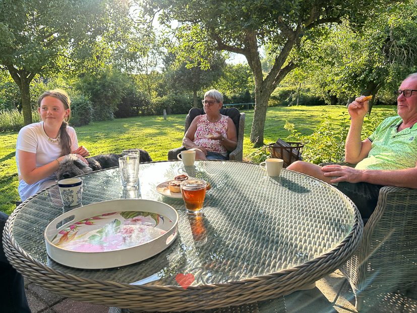Johan en ik ontbijten/lunchen in de tuin met een tosti, cappuccino en koffie. Genieten! Daarna gaan we aan het werk. Zo moet onder andere het gras hoognodig gemaaid worden. Ook maak ik verse boeketjes bloemen voor in huis met bloemen uit de tuin. Heerlijk dat dat nu weer kan.