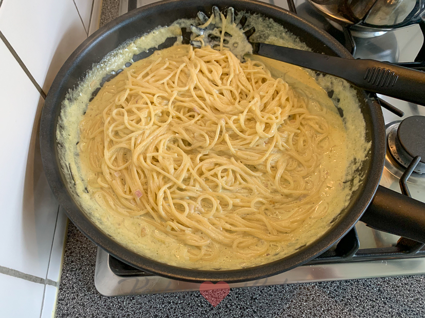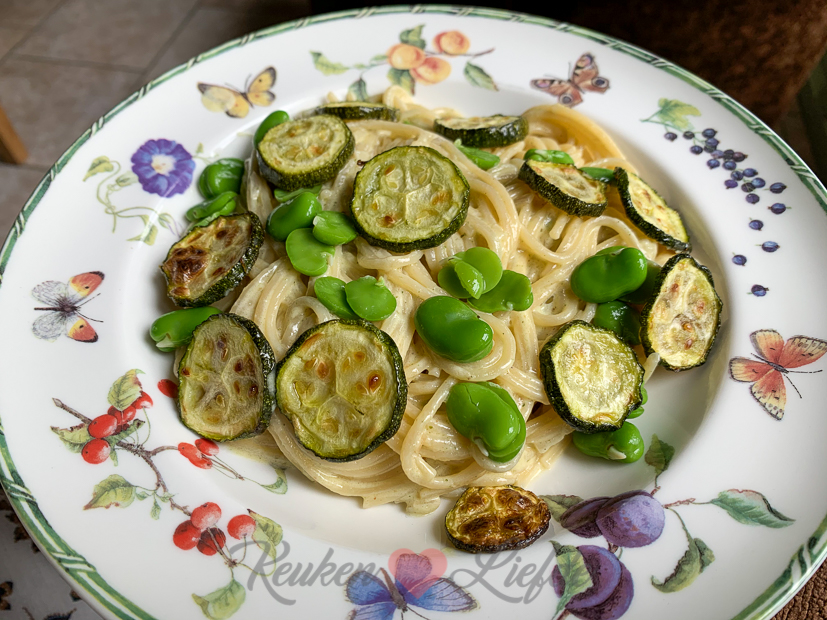 Voor het avondeten maak ik een romige pestosaus (paar zelfgemaakte eetlepels pesto verwarmen met 200 ml slagroom) met spaghetti. In de vriezer vind ik nog wat tuinbonen die ik kort even kook en dubbel dop en uit de moestuin pluk ik twee courgettes die ik in plakjes snijd en rooster in de oven. Simpel en heerlijk maaltje!