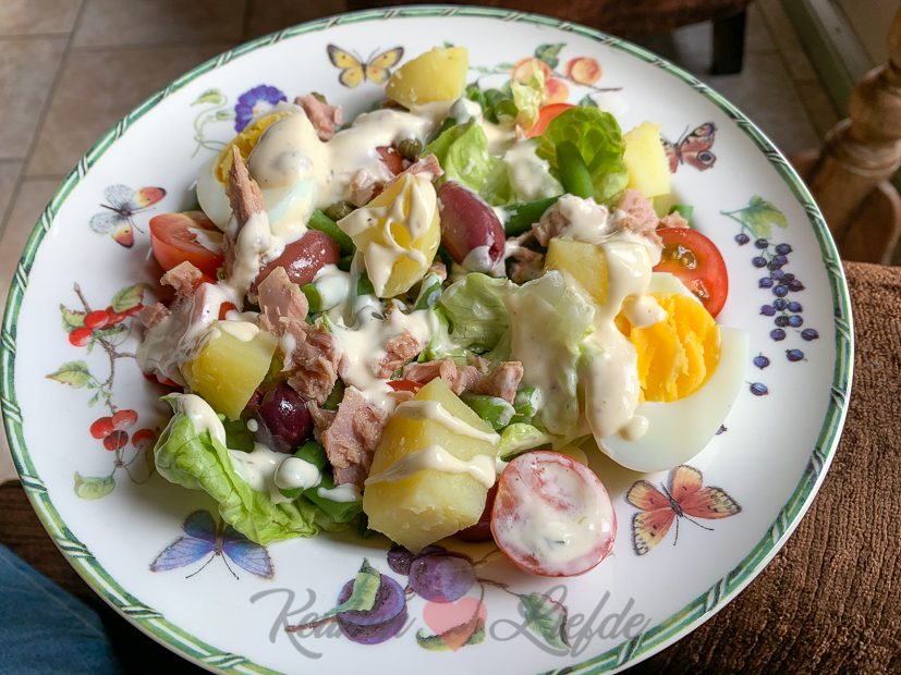Vandaag staat er een salade niçoise op het menu met kropsla uit de moestuin. Dit is echt een van mijn favoriete maaltijdsalades in de zomer. Het recept vind je hier. De dressing maakte ik trouwens van 2 eetlepels mayonaise losgeroerd met 2 fijngeprakte ansjovisfilets, wat citroensap en een scheut zoet-zuur augurkennat. Erg lekker. Trouwens, voor de campinggangers onder ons: dit is een ideaal campingrecept! 🙂