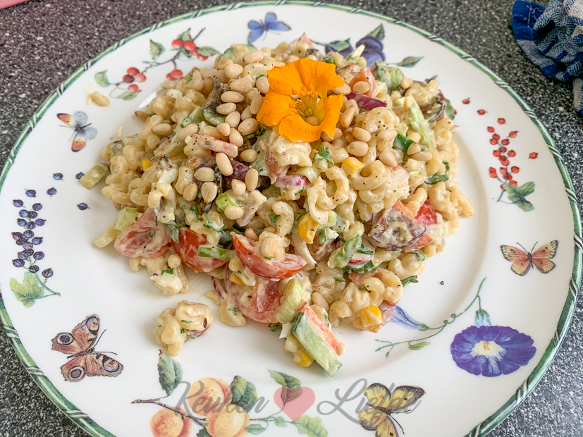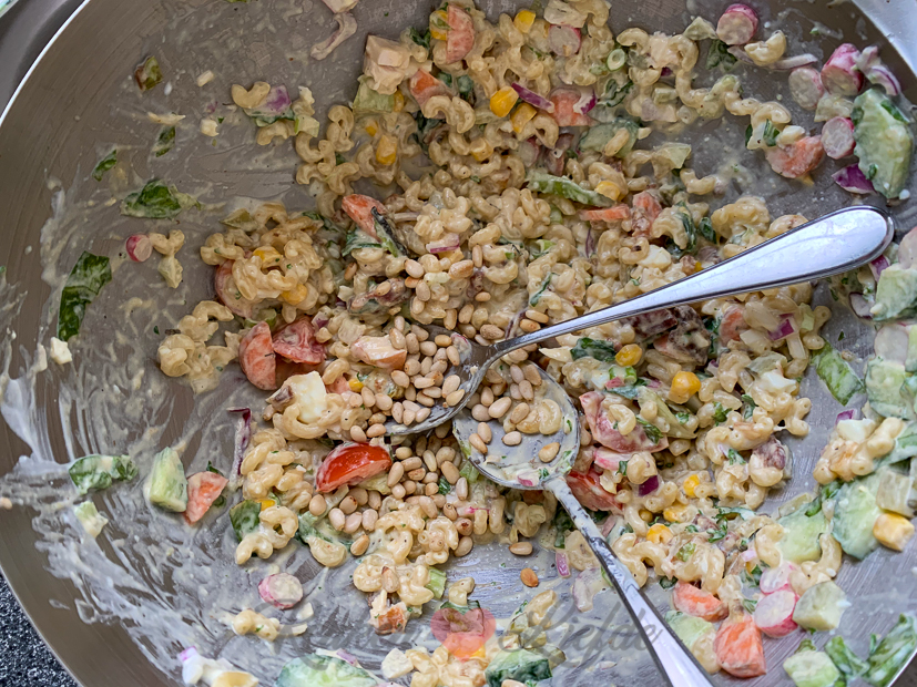 Johan kookt vandaag en maakt zijn befaamde pastasalade. Die smaakt altijd anders, want hij gebruikt ingrediënten die op dat moment in de koelkast liggen. Dit keer lagen er veel kliekjes in de koelkast, dus de pastasalade was goedgevuld. Ik kan me hier echt ziek aan eten, zo lekker vind ik het! Restaurants moeten dit toch ook gewoon op de lunchkaart zetten? Lauwwarme pastasalade met vulling van de dag, geserveerd met warme croutons of stokbrood. Mmmmm… Kunnen ze meteen mooi de kliekjes opmaken! De macaronisalade maak je lekker smeuïg met een ordinaire lepel mayonaise, (soms wat yoghurt), een lepeltje mosterd, een lepeltje sushiazijn, een scheutje zoet-zuur augurkennat (geniaal spul voor dressings!) en een druppeltje maggie. Verder op smaak brengen met wat zout en peper.