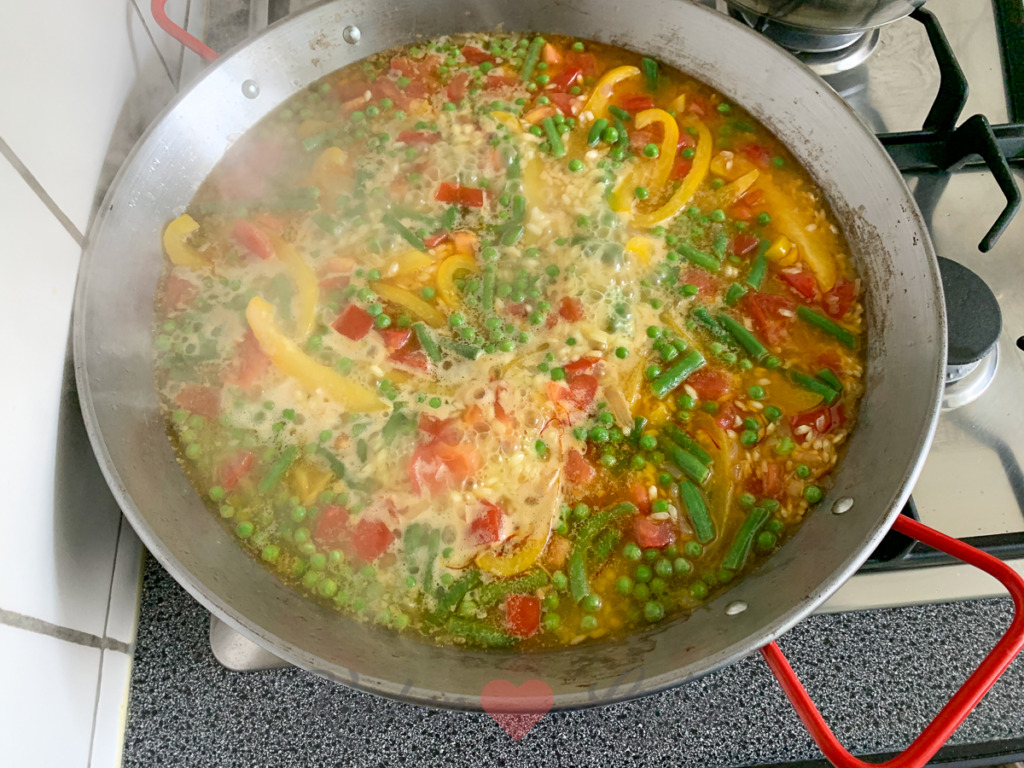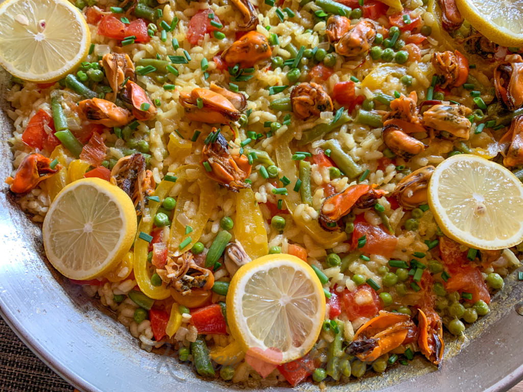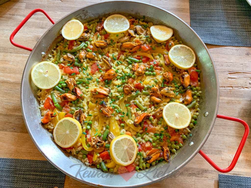 ’s Avonds eten we paella met mosselen. De mosselen had ik eigenlijk gekocht voor afgelopen zaterdag of zondag, maar toen hadden we er geen zin in. Omdat ze maar tot gisteren houdbaar waren hebben we ze gisteren alvast gekookt. Terwijl Johan de gekookte mosselen uit de schelp haalt, bereid ik alvast de paella in het bewaarde mosselvocht. De laatste paar minuten leg ik de mosseltjes bovenop de paella om ze op te warmen. Het lekkerste is natuurlijk om de rauwe mosselen gewoon met schelp en al bovenop de paella te leggen en dan te laten garen, maar vooruit, zo kan het ook. Ook paella maken? Hier vind je verschillende recepten.