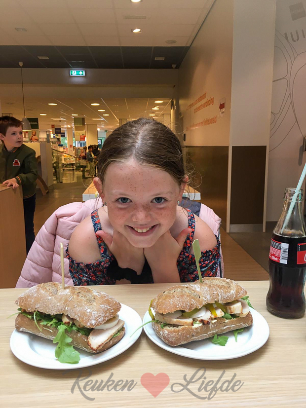 Omdat ik afgelopen week geen nieuwe KL-recepten heb gemaakt, moet ik er vandaag aan geloven. Ondertussen gaan Johan en Ella-Marie even buurten bij Johan zijn ouders en daarna gaan ze nog even de stad in. Ze lunchen bij de Hema met een broodje Surinaamse kip en sturen mij deze foto door.
