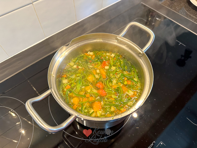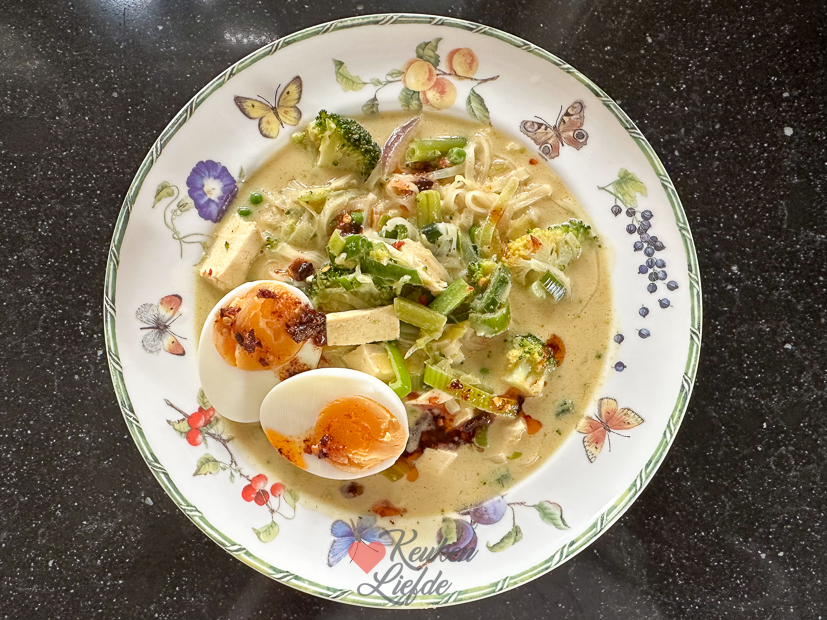 Eitjes hardkoken in de pan. In andere pan wokgroenten met geperste knoflook en chilivlokken aanfruiten. Dan currypasta en verkruimelde kippenbouillontablet erbij en kort meebakken. Kokosmelk erbij en lege blik vullen met water. Omschudden en ook erbij. Aan de kook brengen en dan het vuur lager zetten. Dan half blok tofu in blokjes erbij en glasnoedels erboven in hapbare stukken verkruimelen. Deksel op de pan en paar minuten zachtjes laten pruttelen tot groenten en noedels gaar zijn. Opscheppen en serveren met eitje en eventueel wat crispy chili olie. In 15 minuten klaar en superlekker! Je kunt de rijstnoedels trouwens ook weglaten en er apart rijst bij koken.