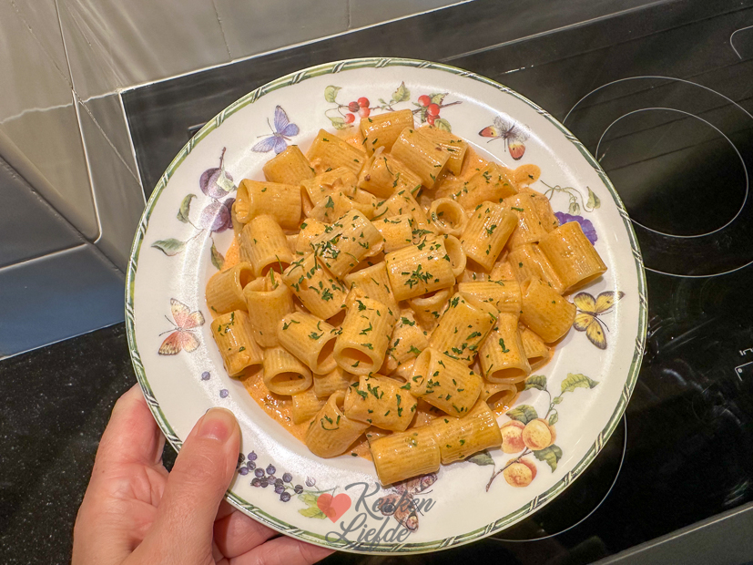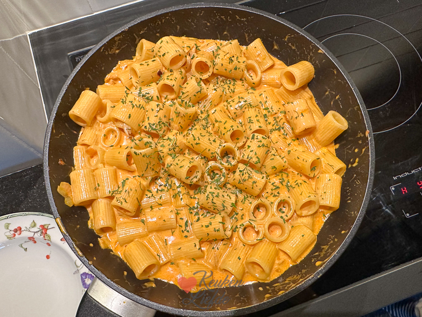 Weer thuis maakte ik snel een pastaatje met wat we nog in huis hadden. Pasta koken. Ondertussen in koekenpan sjalotje, knoflook en chilivlokken aanfruiten. Tomatenpuree kort meebakken en room (kookroom of slagroom) erbij om een lekkere tomatenroomsaus te maken. Wat geraspte parmezaan erdoor roeren. Dan gekookte pasta erbij en opscheppen. Ik had geen groente meer in huis maar je kunt tegelijk met het sjalotje courgette, aubergine of paprika meebakken (of allemaal). Of serveer de pasta met een lekkere salade.