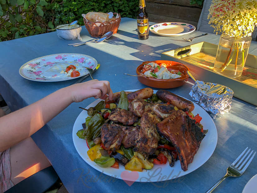 ’s Avonds gaan we barbecueën. Op de barbecue gaat een grote pan met groenten, worstjes, gemarineerde kippendijen, spareribs en erbij wat stokbrood en een tomatensalade met feta.