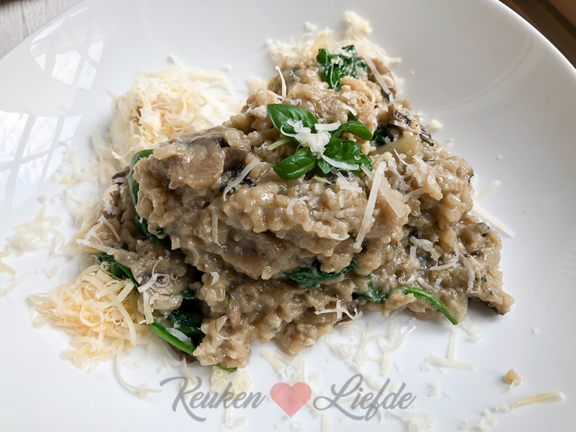 Wederom zorgt de diepvries vandaag voor een makkelijke maaltijd. We eten truffelrisotto met champignons uit het kookboek KOKEN MET KEUKENLIEFDE. Heb jij hem al gereserveerd? Dat kan hier! Door nu alvast een exemplaar te reserveren valt hij zodra hij gedrukt is (rond 17 oktober) automatisch bij jou op de deurmat. 🙂 Ik gooi trouwens nog een handje spinazie door de risotto omdat die nog in de koelkast ligt en op moet. Ook opgewarmd uit de diepvries smaakt de risotto nog heerlijk.