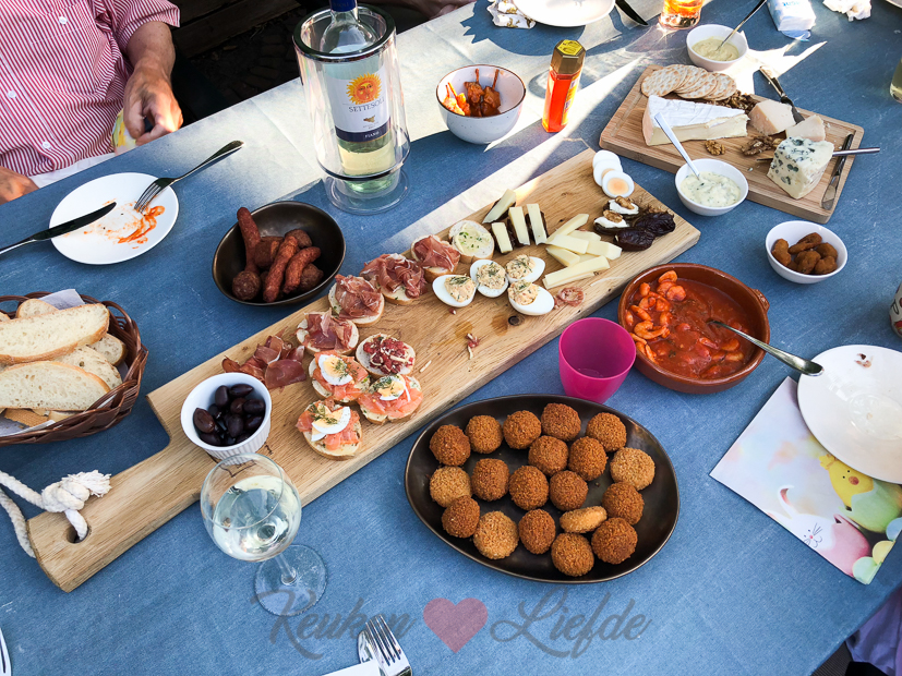 Als aperitief maak ik Negroni-tonic cocktails uit het kookboek Simple Food van Sergio Herman. Als diner serveer ik een grote borrelplank met allerlei lekkers en we sluiten de avond af met zelfgemaakte amandeltaart. Smullen!