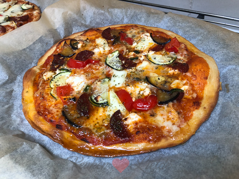 ’s Avonds eten Johan en ik pizza. Johan een kant-en-klare margherita pizza en ik maak pizza van een bolletje zelfgemaakt pizzadeeg. Beiden lagen nog in de vriezer.