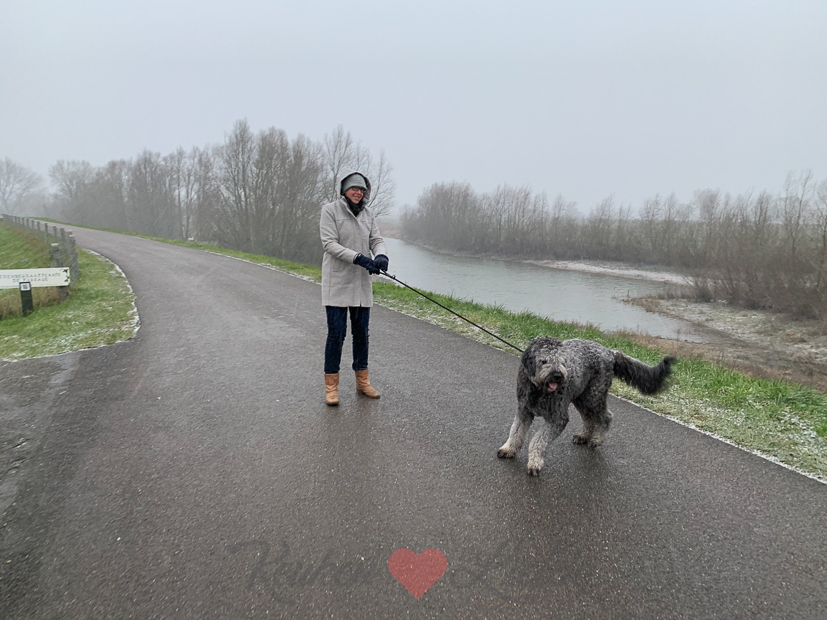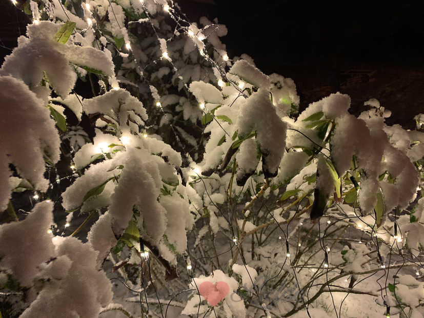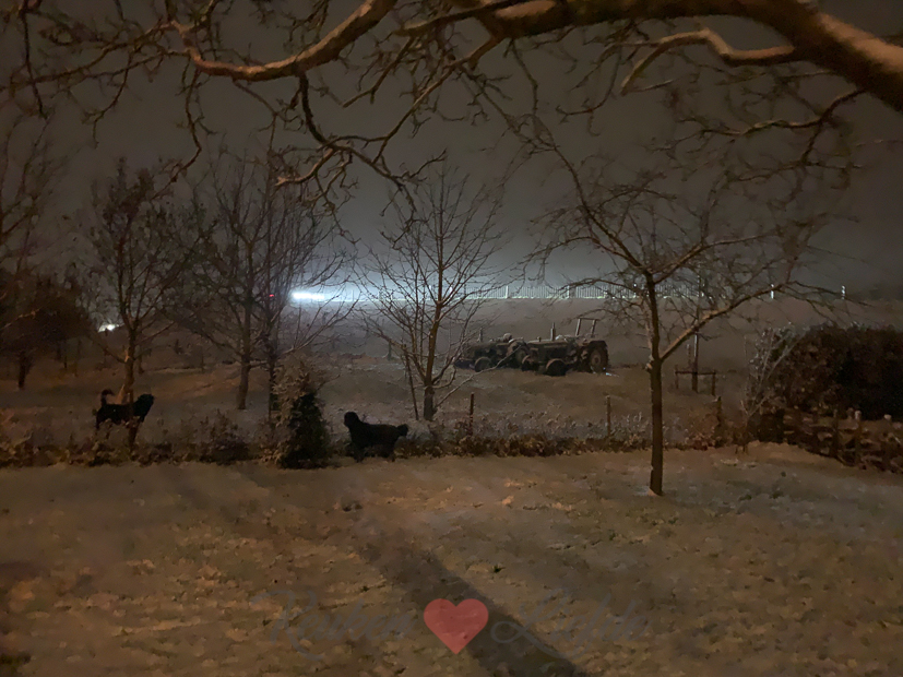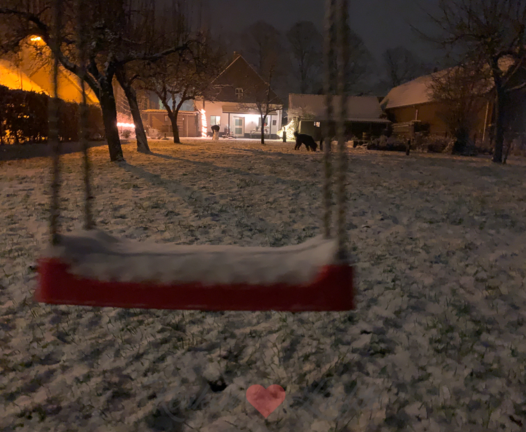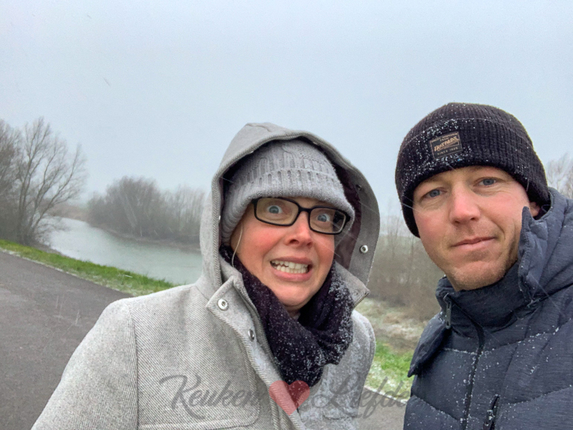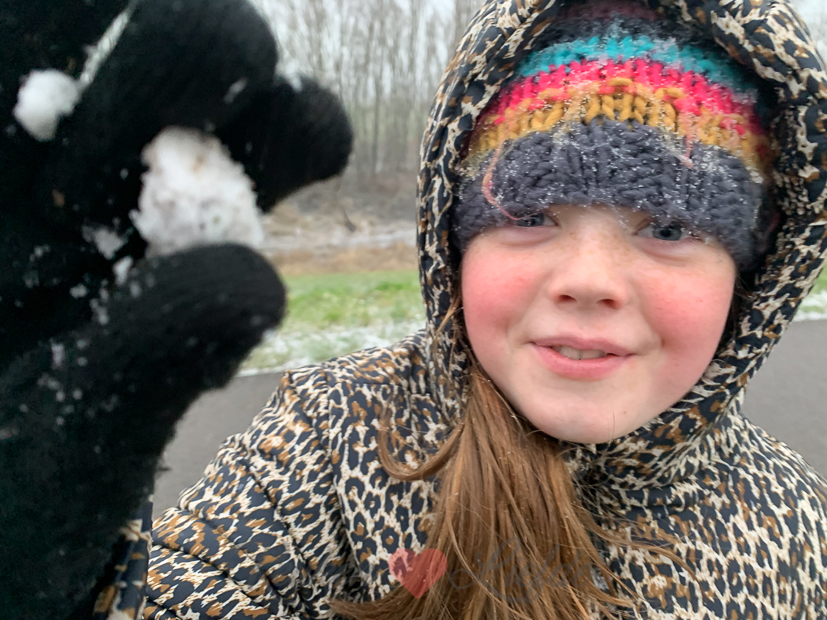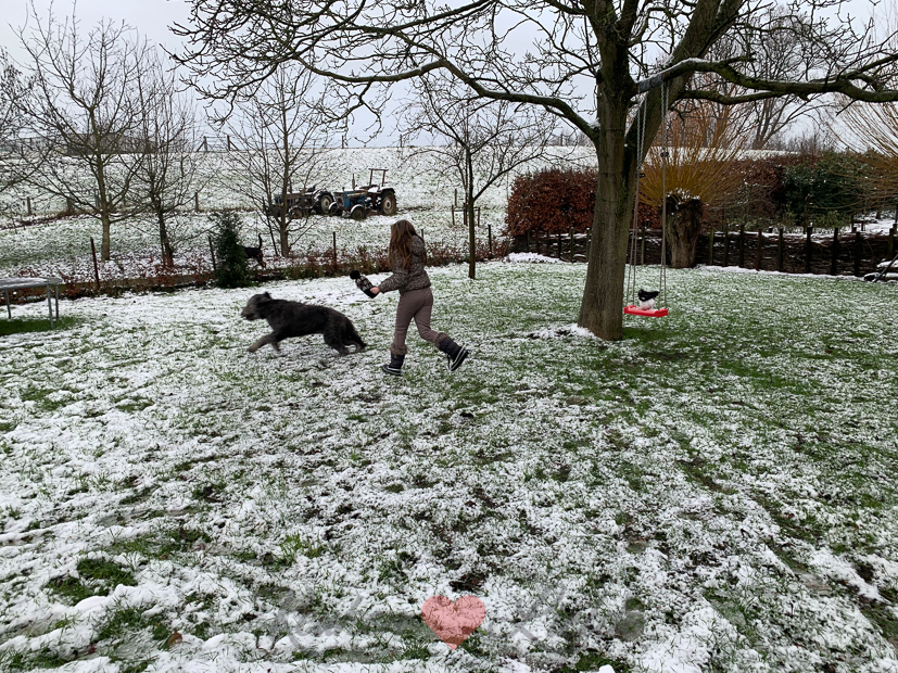 Eind van de middag gaan we met z’n drieën wandelen met Nacho. Die wandelingen aan het eind van de middag zijn een verademing na een hele dag binnen zitten. Het begint net te sneeuwen als we weggaan. Ella-Marie vindt de sneeuwvlokken geweldig en moet overal even stoppen om sneeuw te verzamelen. Ik vond het vooral koud en kon alleen maar denken aan botermalse ribbetjes die op ons lagen te wachten voor het avondeten.