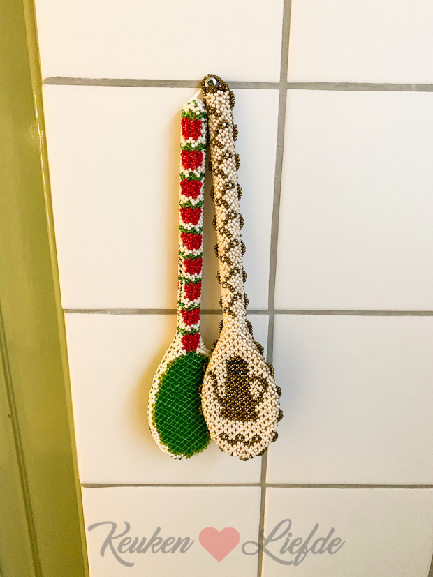 Eind van de ochtend kwamen Johan zijn ouders wat spullen brengen van Johan zijn opa en oma (helaas nu allebei overleden) die we graag wilden hebben: o.a. deze houten lepels die de oma van Johan met kralen had versierd.