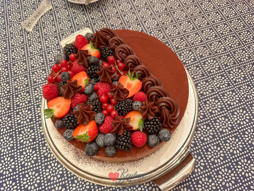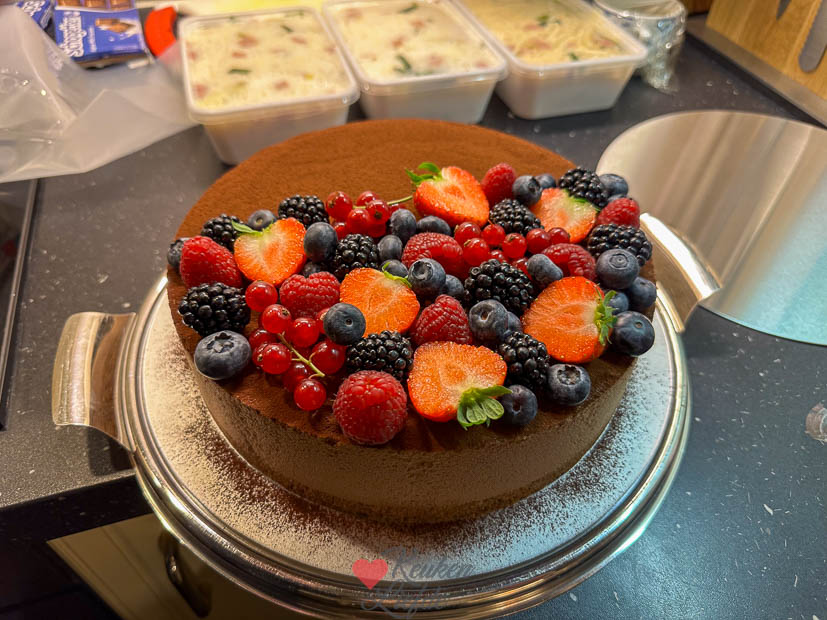 ’s Avonds rijden de tiener en ik naar mijn ouders voor een verlaat verjaardagsdiner van mijn broer. Er werd Chinees besteld en dat smaakte heerlijk! Als toetje had mijn broer de Toblerone taart van KeukenLiefde gemaakt die hij zelf nog mooi garneerde met vers fruit en chocoladeganache. Hij smaakte net zo lekker als hij eruit zag.