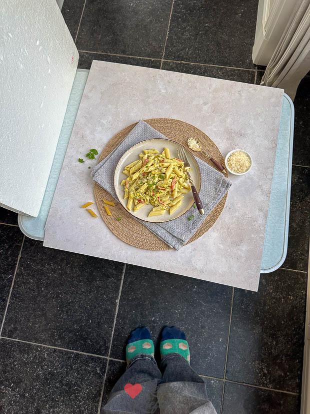 - Deze poes kijkt toe hoe ik binnen foto’s sta te maken van de pasta.