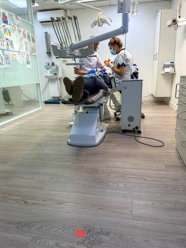 Eind van de middag rijd ik met de tiener naar de tandarts waar ze een sealing krijgt om haar kiezen beter te beschermen en er wordt een mal gemaakt van haar gebit voor een nachtbitje tegen het tandenknarsen dat ze doet. In de wachtkamer kwamen we heel toevallig mijn schoonzus tegen. 🙂