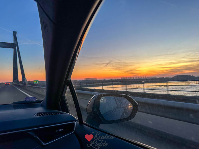 Als we over de waalbrug weer terug naar huis rijden zie ik hoe hoog het water staat. De gouden gloed van de ondergaande zon aan de horizon zorgde voor een picture perfect. Thuis hoefde ik de butter chicken alleen maar weer even op te warmen en konden we lekker eten.