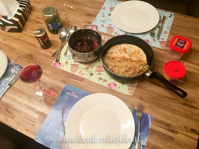 ’s Avonds eten we nasi goreng en gesmoorde kippendijen in ketjapsaus (dit recept maar dan met kippendijen gemaakt) die ik eerder gemaakt heb uit de diepvries.