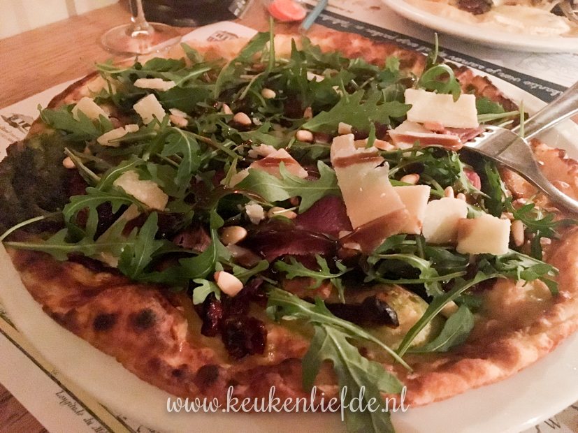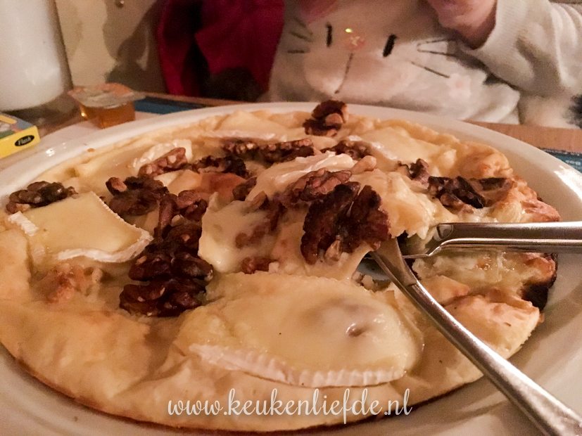 Ella-Marie neemt een pannenkoek met brie, walnoten en honing. Ik kies de pannenkoek met carpaccio, rucola, zongedroogde tomaten, pijnboompitjes, Parmezaan en balsamicodressing. Lekker!