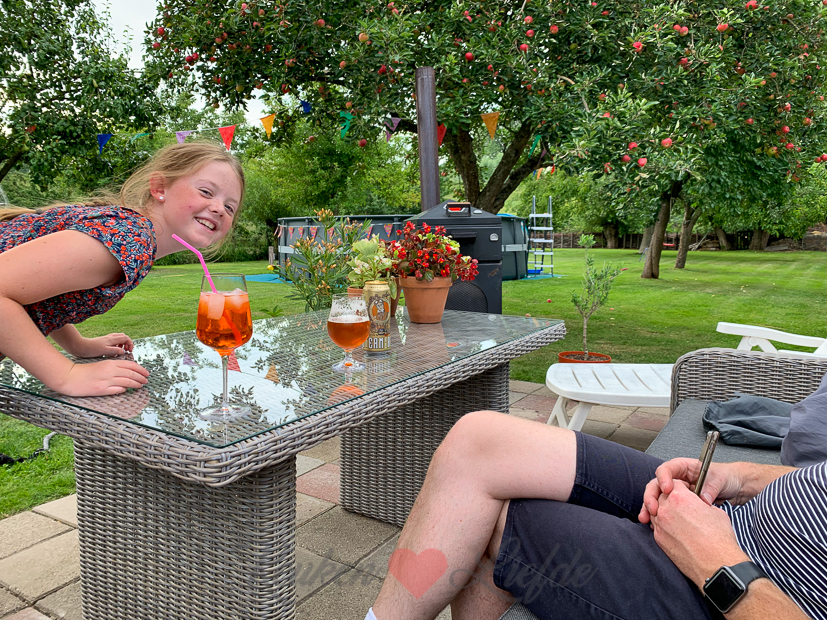Als we alles gedaan en opgeruimd hebben, strijken we moe maar voldoen met een drankje neer in de tuin.