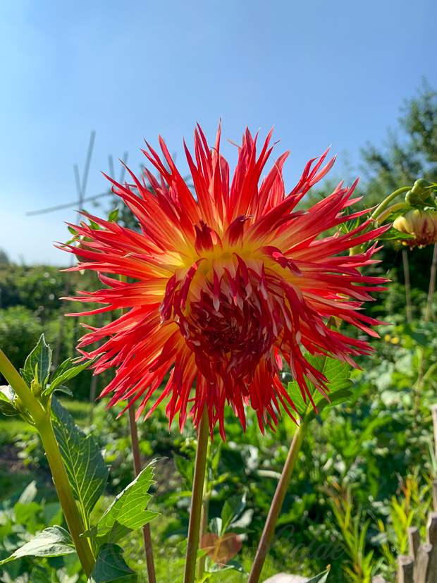 De dahlia’s die voor de moestuin tegen het schapenhek staan beginnen nu ook volop te bloeien. Die weelderige vormen en felle kleuren, ik hou van dahlia’s!
