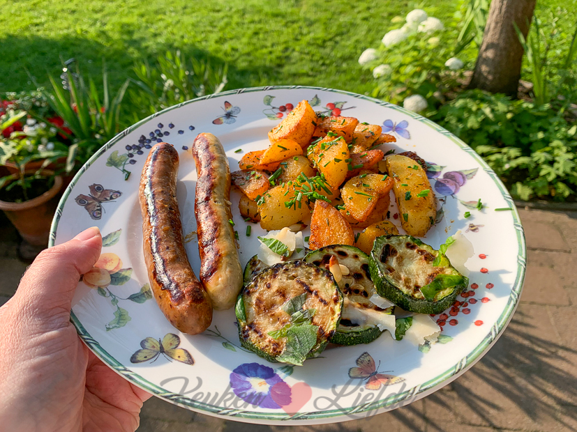 En weer gaat ’s avonds de barbecue aan. Ik had nog een zak voorgekookte aardappelpartjes liggen en twee pakken UNOX chipolata worstjes en die kunnen prima op de barbecue worden bereid. De aardappeltjes bak ik in de paellapan en de worstjes op de bakplaat. Erbij de gegrilde courgettes die ik vanmiddag had gemaakt. Was heerlijk.