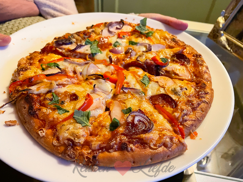 Daarna gaan we nog even aan de slag om wat voorbereidingen voor morgen te treffen. Voordat we overal klaar mee zijn is het half negen en hebben we geen zin meer om te koken. Diepvriespizza it is. 🤭