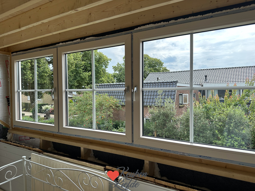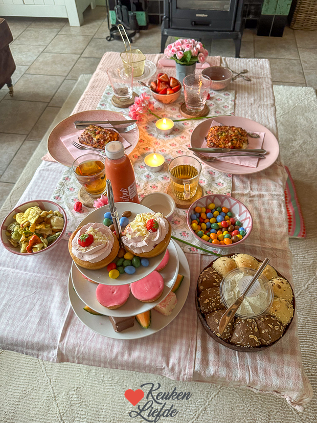 Ella-Marie en een vriendinnetje hebben een high tea in de woonkamer. Ella had zelf boodschappen gedaan en daarna de salontafel gedekt met allerlei roze borden, kommetjes, glazen en doekjes van mijn fotografie props voor KeukenLiefde. Zo gezellig! ❤️Ondertussen wordt boven op de oude slaapkamer van Ella het nieuwe raamkozijn in de dakkapel gezet. Er komen nog plakroedes op de ramen, maar door een miscommunicatie komen die iets later. Heel blij met de dakkapel en de extra ruimte!