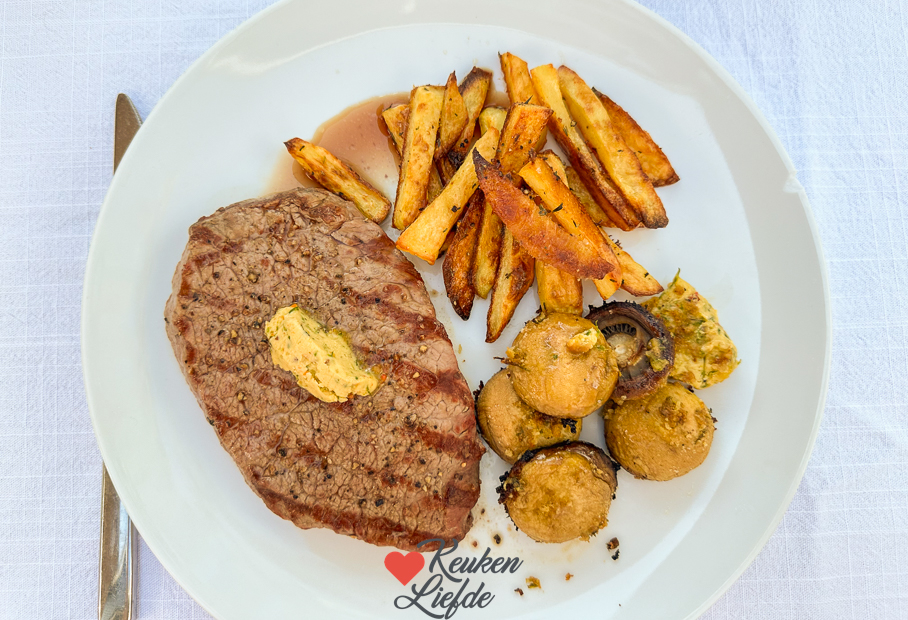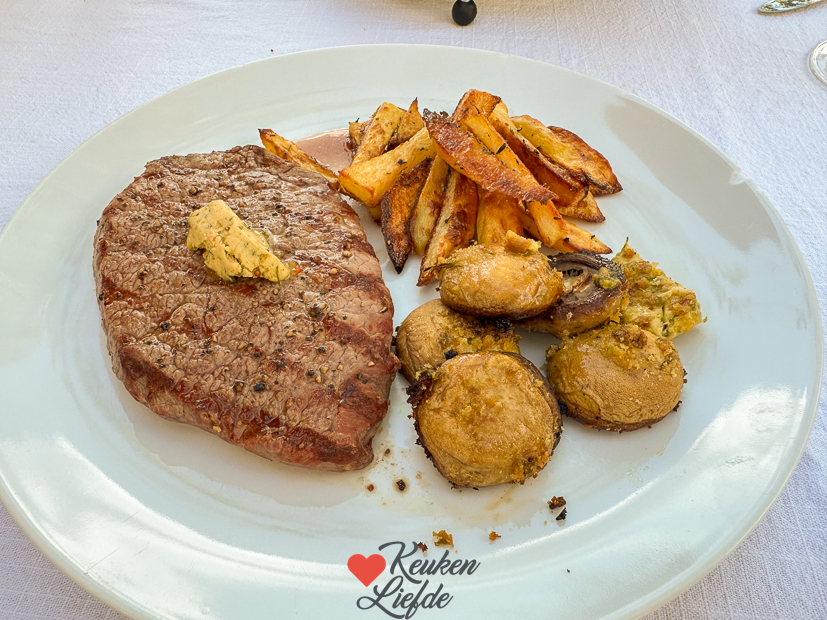 We ontbijten met cheesecake. Wat anders! De rest van de dag vermaken we ons thuis. ’s Avonds eten we kogelbiefstuk van de barbecue, mais, champignons uit de skillet met cafe de paris boter en panko en zelfgemaakte ovenfrietjes. Smullen!