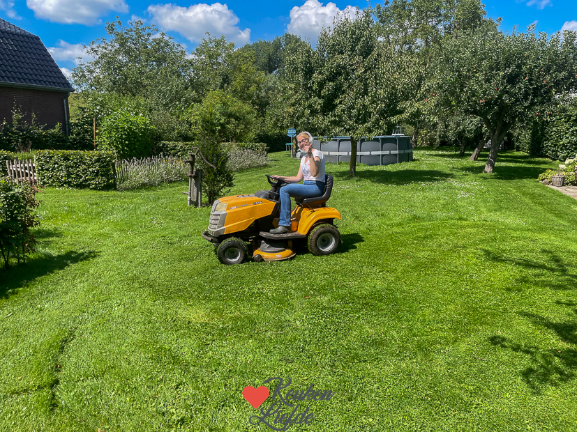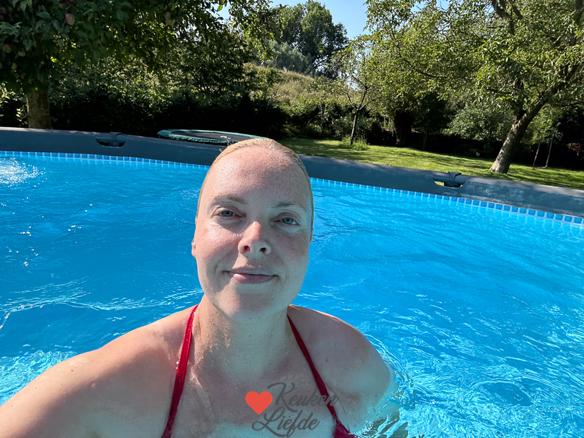 Johan en ik zitten ’s ochtends een paar uurtjes op kantoor voor werkdingen en administratie. Ella fietst naar opa en oma want haar neefje is daar ook. Ik lunch ’s middags met een lekker stokbroodje met ham, kaas en ananas. Ik ben dol op die combi. Eind van de middag duik ik even het zwembad in. Helemaal alleen, even zwemmen en dopperen op een luchtbedje. Genieten.