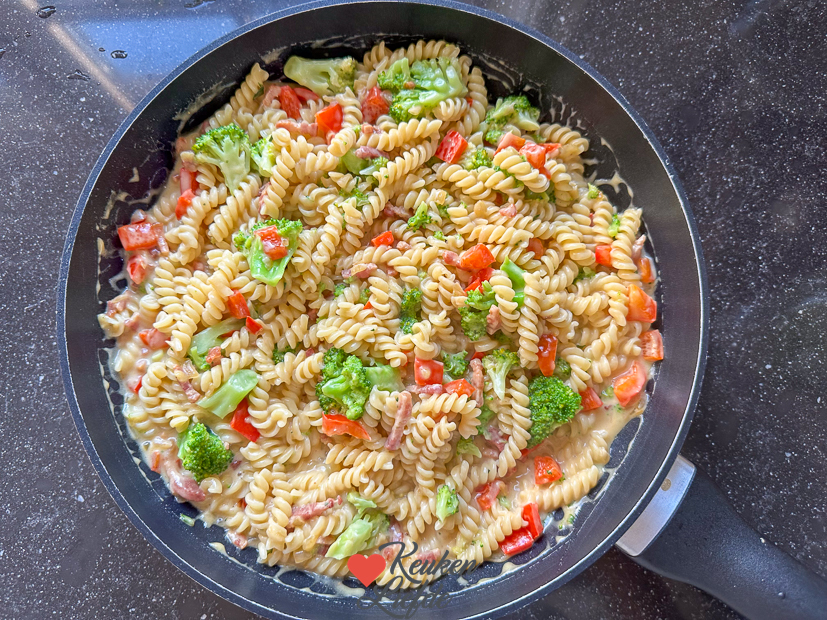 125 g spekjes uitbakken in de koekenpan, dan 1 gesnipperde ui, 1 uitgeperst knoflookteentje, 1 rode paprika in blokjes en 1 verkruimelde kippenbouillontablet erbij en meebakken tot paprika beetgaar is. Dan 250 ml koud water toevoegen en een zakje kaassaus erdoor roeren. Verwarmen tot saus gaat binden en even laten pruttelen. Ondertussen 360 g pasta naar keuze al dente koken, de laatste 3 tot 5 minuten (afhankelijk van hoe gaar je hem wilt) van de kooktijd broccoliroosjes (van 1 broccoli) met de pasta meekoken. Pasta en broccoli afgieten (kop kookvocht opvangen) en bij de saus doen. Eventueel wat opgevangen kookvocht erbij als saus te dik is. Omhusselen en opscheppen. Voor twee personen maak ik de saus op dezelfde manier met iets minder broccoli en minder pasta. Ik houd van pasta met veel saus. 😁 Ook lekker om een handje geraspte parmezaan door de saus te roeren voor een extra kazige smaak. Houd ik ook van.