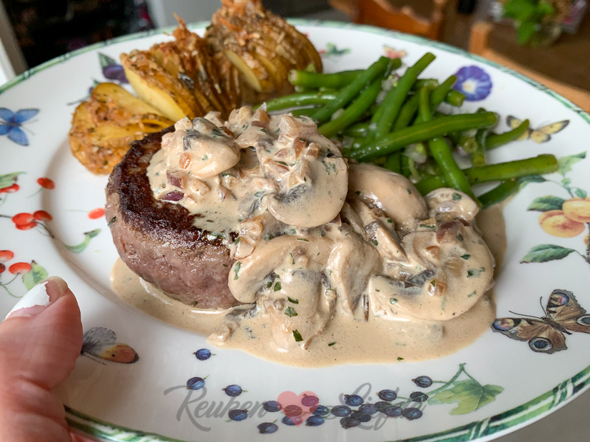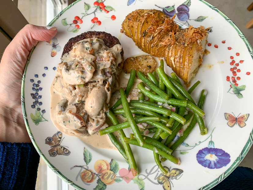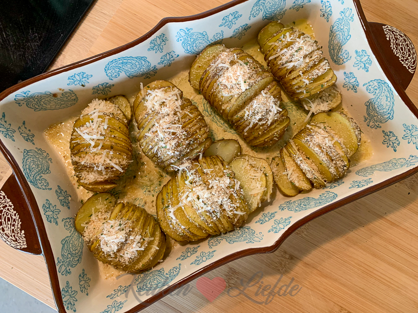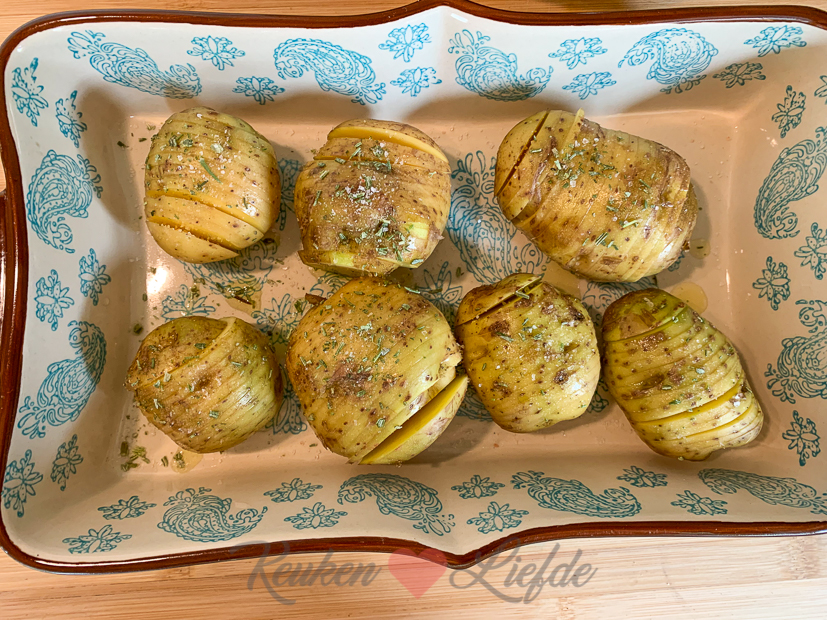 ’s Avonds eten we een lekker maaltje met hasselback aardappels, Duitse sperziebonensalade en Duitse biefstuk met champignonroomsaus. Onderstaande ovenschaal vind je hier in onze webshop!